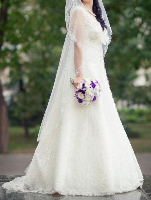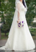 Свадебное платье от Татьяны Григ "Лилу", размер 46 на рост 175 см, цвета айвори, со шлейфом, который можно пристегнуть к юбке, подъюбник на 2 кольца, перчатки - манжеты (без пальцев): расшитые бисером такого же цвета, как и платье, фата с легкой кружевной отделкой. Все после химчистки.